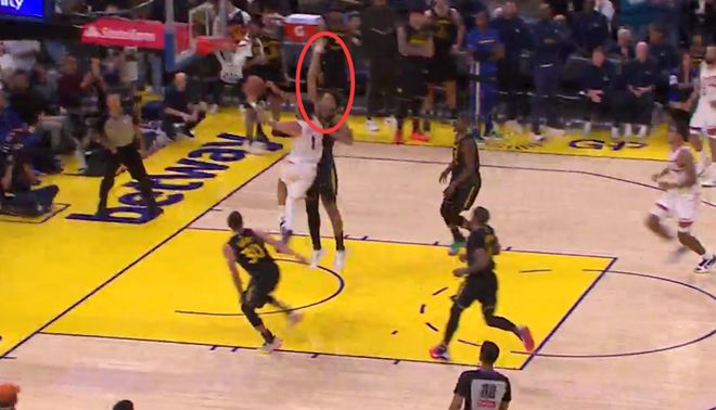 第一次是錯判,發生在距離比賽結束還有50.6秒。裁判報告指出,勇士隊的杰克遜-戴維斯高高躍起,扛住了與太陽隊布克的身體對抗。他試圖封蓋時,刻意避開了布克的手臂,沒有發生接觸。當時裁判判罰勇士防守犯規,布克2+1是錯判,這是沒有問題的防守。勇士吃虧,太陽獲利。