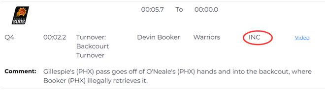 第三次也是漏判,發生在距離比賽結束還有2.2秒。裁判報告指出,太陽隊吉萊斯皮的傳球打在了隊友奧尼爾的手上,隨后滾落到后場。此時太陽隊布克上前非法拿回了這個球權,應該判罰回場違例,但裁判也沒有響哨。當然,最終那記超遠三分沒有命中。