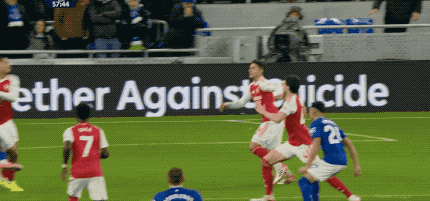 第24分鐘,阿森納獲得角球,禁區內奧布萊恩直接來了一個雙手攔網的標準排球動作,VAR介入,裁判回看過后判罰點球。